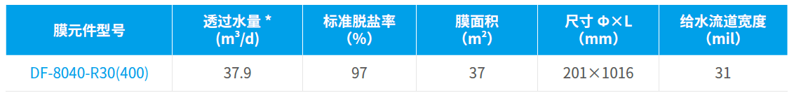 DF30 超低压选择性纳滤膜,是一种截留分子量为150~500 道尔顿,并对溶解性无机盐具有选择透过性的低压分离膜产品,具有工作压力低及水回收率高的特性,可高效去除PPCPs、EDCs 等微量有机污染物及细菌、病毒等微生物,保留矿物质。该产品是国家“十二五”水专项重大标志性成果,入选“国家鼓励发展的重大环保技术装备目录”和“中关村国家自主创新示范区首台套重大技术装备示范项目”,荣获“北京市新技术新产品”、“国家战略性创新产品”、“国家重点新产品”等科技荣誉,获得“中国优秀专利奖”、“教育部科技进步一等奖”以及“国家科技进步二等奖”等奖项。