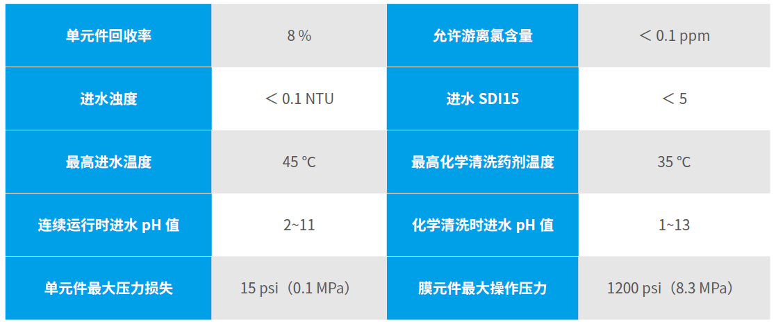 寿命长 独特元件结构及后处理工序,配合34mil 进水宽流道,可在更宽泛的pH(1~13)内达到有效清洗效果,使元件更经久耐用;