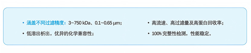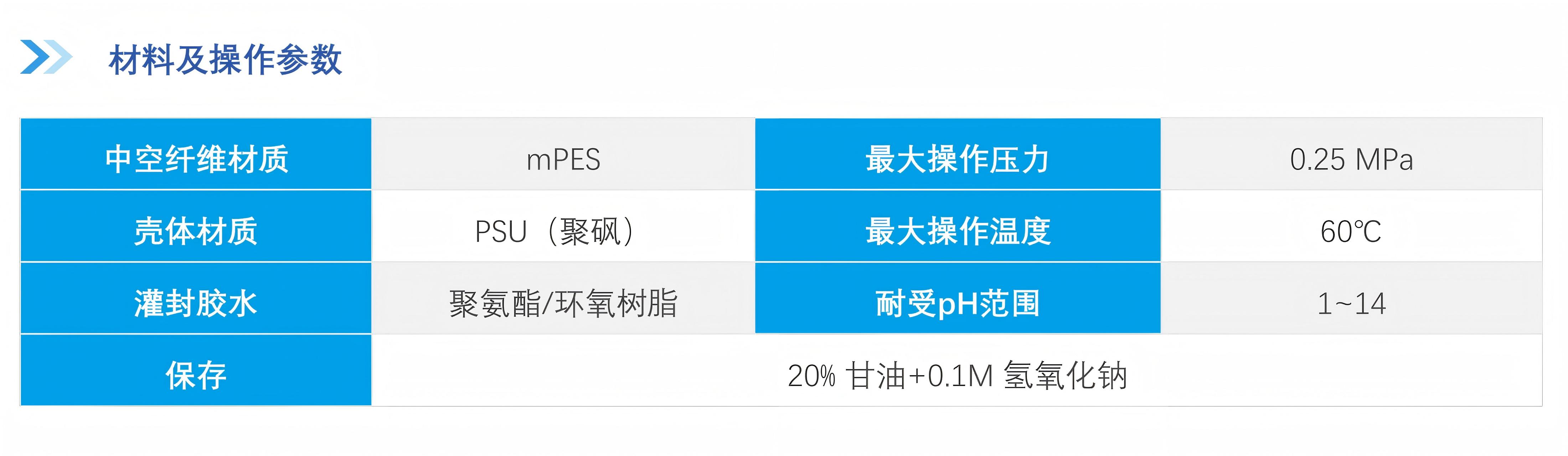 中空纤维膜丝采用改性聚醚砜(mPES)制备,抗污染性能强;非对称梯度孔结构及均一孔径保证高过滤精度的同时能获取更高通量,提高产品收率。中空纤维膜柱采用符合医疗级别的外壳材料,生物相容性优异,在灭菌环境中稳定性优良;选用的胶黏剂粘接强度高,耐热性、耐化学性及生物相容性优良;同时采用优化的注胶工艺,注胶精度高,产品无缺陷。