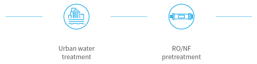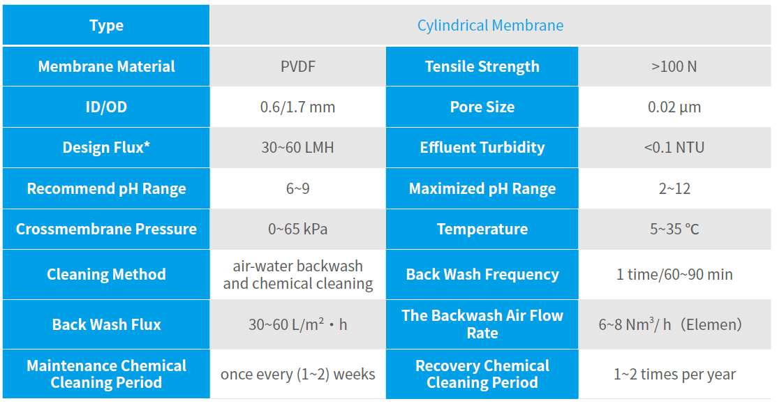 Excellent effluent quality: Narrow membrane pore size distribution, high filtration precision, more than 6log of bacterial retention rate, more than 41og of virus retention rate;