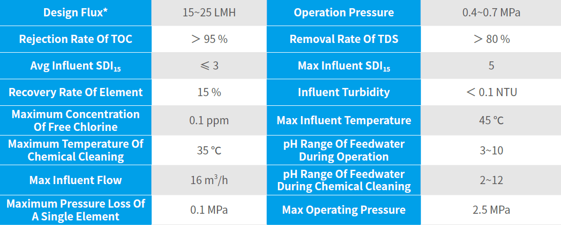 Low operation pressure: The system's operating pressure is 0.4~0.7MPa and is above 30% lower than the traditional low-pressure RO membrane;