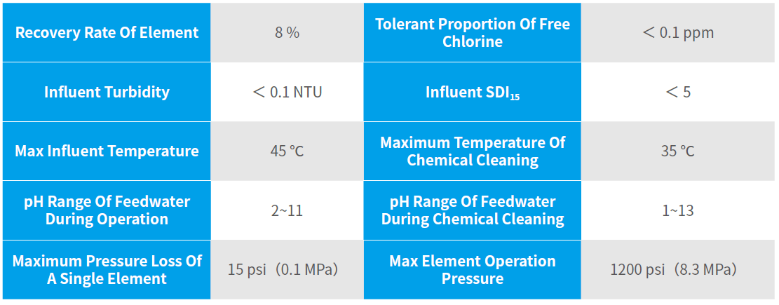 Long service life: Due to unique element structure, post-treatment process as well as 34mil feed spacer, the effective cleaning effect can be reached within a wide range of pH (1~13) and the element becomes more durable;