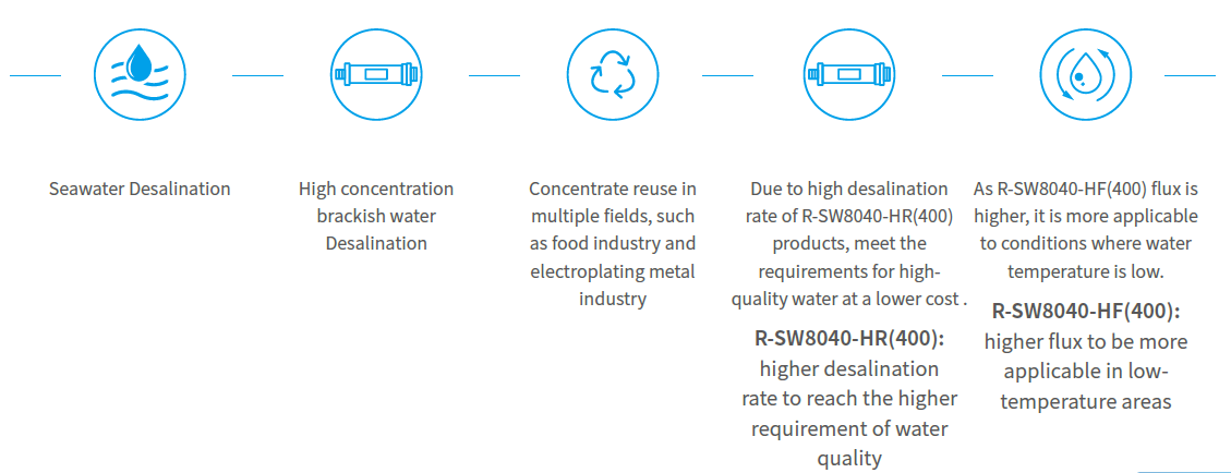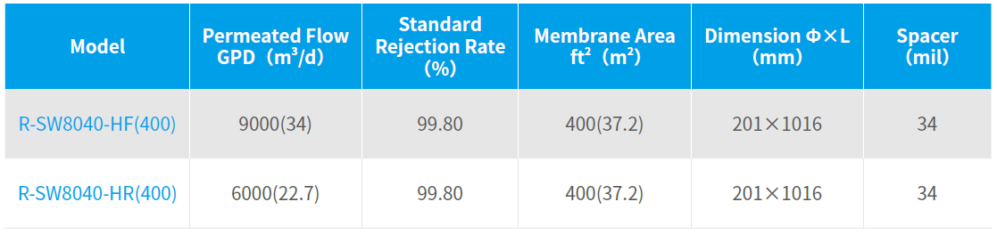 Low energy consumption: Improve and optimize the aromatic polyamide desalting layer and develop larger specific surface area to reduce the operation pressure and to save the energy with the same water production.