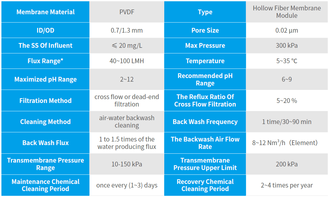 Excellent effluent quality: Narrow membrane pore size distribution, high filtration precision, effluent turbidity less than 0.5NTU;