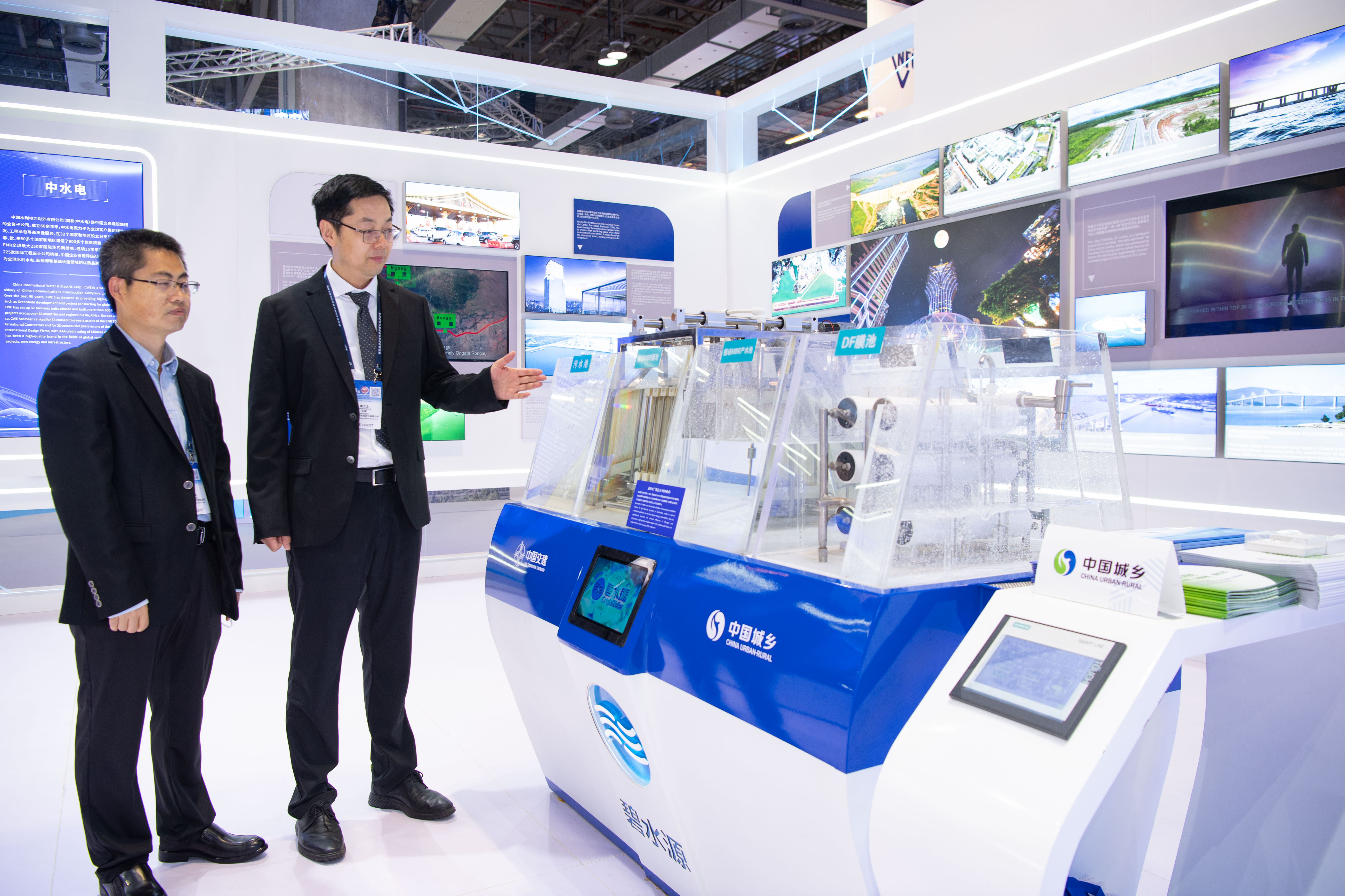 在中国城乡控股集团有限公司的展位,来自肯尼亚的客商认真观看应用了新型低碳振动膜技术的污水资源化产品演示,并不时向工作人员咨询细节。